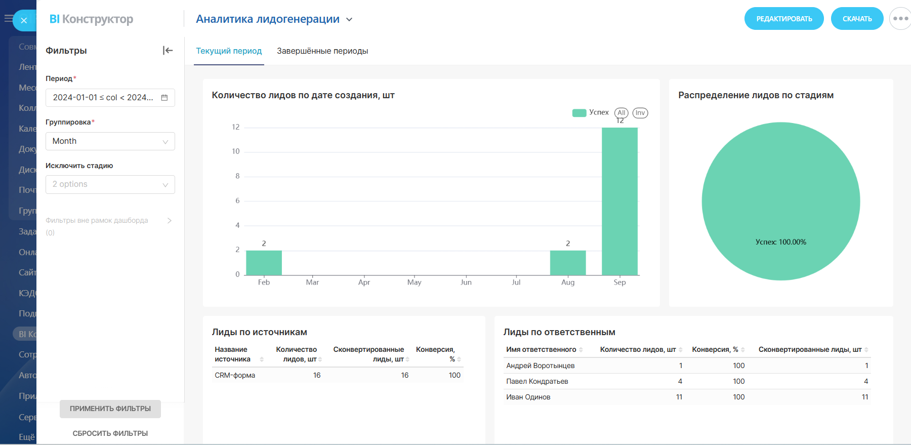 Благодаря гибким и адаптивным настройкам BI-конструктора, возможно отслеживать динамику и текущие тенденции генерации лидов для дальнейшего улучшения показателей работы маркетингового отдела.